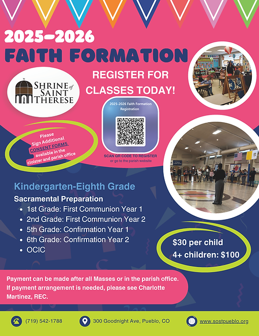 All religious formation classes (kindergarten through Confirmation) are held Sundays from 9:15 – 10:45 am in the gymnasium and school building. Please contact Charlotte Martinez (719) 542-1788 ext. 7 for more information.